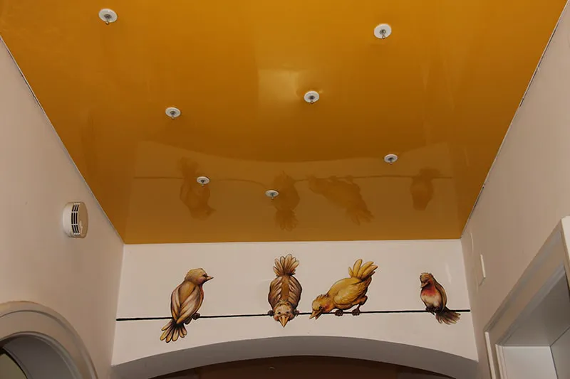 • Einbau von gelben und roten Glanzdecken kombiniert mit Lichtdecken