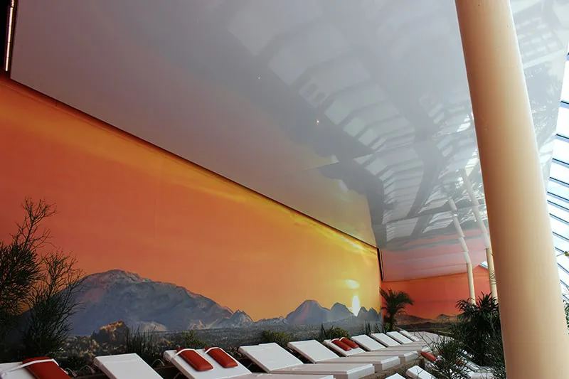 • Gestaltung der neuen Ruheräume in der Therme Bad Wörishofen. Besonderheit der Gestaltung mit geschwungener Säulenkonstruktion. Deckengrößen bis 90 qm an einem Stück. Bedruckte Wandbespannung in einer Größe von 3,16 x 5,70 m.